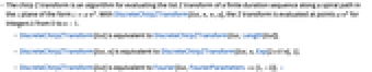 - DiscreteChirpZTransform[list,n] is equivalent to DiscreteChirpZTransform[list,n,Exp[2π /n],1].