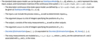 - The standard state-space model ssm can be given as StateSpaceModel[{a,b,c,d}], where a, b, c, and d represent the state, input, output, and transmission matrices of the continuous-time system