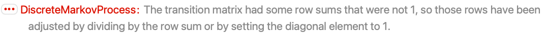of non-negative elements that sum to 1. - DiscreteMarkovProcess can be used with such functions as MarkovProcessProperties, PDF, Probability, and RandomFunction.