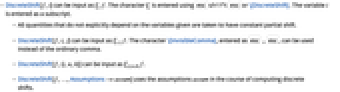 - DiscreteShift[f,…,Assumptions->assum] uses the assumptions assum in the course of computing discrete shifts.