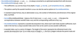 - DiscreteWaveletData[{wind1->coef1,…},…] is always converted to an optimized standard form with structure DiscreteWaveletData[coefs,winds,…].
