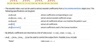. Each integer represents a vector of operations performed along each dimension of the data, where the exact correspondence is given by MapThread[Rule,{Range[0,2^n-1],Tuples[{lowpass,highpass},n]}]. - The wavelet index wind can be used to extract wavelet coefficients from a DiscreteWaveletData object dwd. The following specifications can be given: