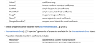 "Rules" rules {wind1->…} "Values" coefficients only "Inverse" inverse transform individual coefficients "ListPlot" simple list plots for 1D coefficients "MatrixPlot" simple matrix plots for 2D coefficients "Image" images for image coefficients "Sound" sound objects for sound coefficients "SampledSoundList" sampled sound objects for sound coefficients - Overall properties can be obtained from DiscreteWaveletData[…]["prop"].