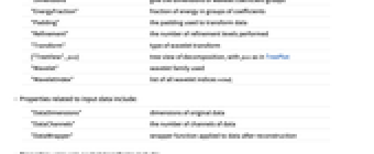"DataDimensions" dimensions of original data "DataChannels" the number of channels of data "DataWrapper" wrapper function applied to data after reconstruction - Properties unique to packet transforms include:
