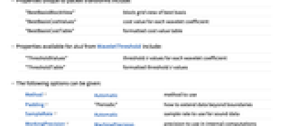 "BestBasisBlockView" block grid view of best basis "BestBasisCostValues" cost value for each wavelet coefficient "BestBasisCostTable" formatted cost value table - Properties available for dwd from WaveletThreshold include:
