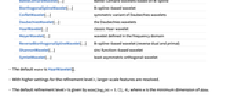 BattleLemarieWavelet[…] Battle–Lemarié wavelets based on B-spline BiorthogonalSplineWavelet[…] B-spline-based wavelet CoifletWavelet[…] symmetric variant of Daubechies wavelets DaubechiesWavelet[…] the Daubechies wavelets HaarWavelet[…] classic Haar wavelet MeyerWavelet[…] wavelet defined in the frequency domain ReverseBiorthogonalSplineWavelet[…] B-spline-based wavelet (reverse dual and primal) ShannonWavelet[…] sinc function-based wavelet SymletWavelet[…] least asymmetric orthogonal wavelet - The default wave is HaarWavelet[].