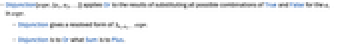 - Disjunction[expr,{a1,a2,…}] applies Or to the results of substituting all possible combinations of True and False for the ai in expr.