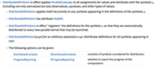 - DistributeDefinitions in effect applies ParallelEvaluate to all assignments for values and attributes with the symbols si, including not only ownvalues but also downvalues, upvalues, and other types of values.