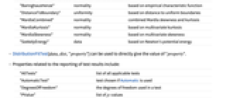 "BaringhausHenze" normality based on empirical characteristic function "DistanceToBoundary" uniformity based on distance to uniform boundaries "MardiaCombined" normality combined Mardia skewness and kurtosis "MardiaKurtosis" normality based on multivariate kurtosis "MardiaSkewness" normality based on multivariate skewness "SzekelyEnergy" data based on Newton's potential energy - DistributionFitTest[data,dist,"property"] can be used to directly give the value of "property".