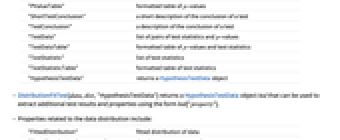 -values and test statistics"TestStatistic" list of test statistics "TestStatisticTable" formatted table of test statistics "HypothesisTestData" returns a HypothesisTestData object - DistributionFitTest[data,dist,"HypothesisTestData"] returns a HypothesisTestData object htd that can be used to extract additional test results and properties using the form htd["property"].