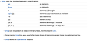 All all elements None no elements n elements 1 through n UpTo[n] elements 1 up to at most n, as available -n last n elements {n} element n only {m,n} elements m through n inclusive {m,n,s} elements m through n in steps of s - Drop can be used on an object with any head, not necessarily List.