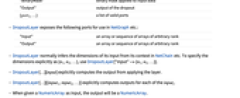 "BinaryMask" binary mask applied to input data "Output" output of the dropout {port1,…} a list of valid ports - DropoutLayer exposes the following ports for use in NetGraph etc.: