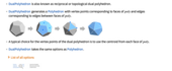 - DualPolyhedron generates a Polyhedron with vertex points corresponding to faces of poly and edges corresponding to edges between faces of poly.