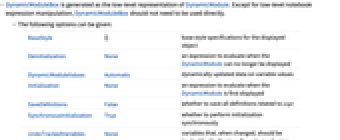 BaseStyle {} base style specifications for the displayed object Deinitialization None an expression to evaluate when the DynamicModule can no longer be displayed DynamicModuleValues Automatic dynamically updated data on variable values Initialization None an expression to evaluate when the DynamicModule is first displayed SaveDefinitions False whether to save all definitions related to expr SynchronousInitialization True whether to perform initialization synchronously UndoTrackedVariables None variables that, when changed, should be tracked by the front end's undo mechanism UnsavedVariables None variables whose values should not be saved