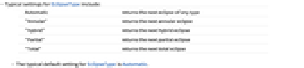 Automatic eclipse of any type "Partial" partial eclipse "Total" total eclipse - The default setting for EclipseType is Automatic.