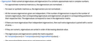 - All the nonzero eigenvectors given are independent. If the number of eigenvectors is equal to the number of nonzero eigenvalues, then corresponding eigenvalues and eigenvectors are given in corresponding positions in their respective lists. The eigenvalues correspond to rows in the eigenvector matrix.