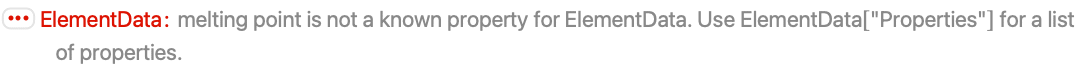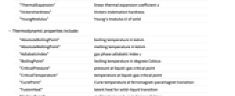 "BoilingPoint" boiling temperature in degrees Celsius "CriticalPressure" pressure at liquid-gas critical point "CriticalTemperature" temperature at liquid-gas critical point "CuriePoint" Curie temperature at ferromagnet-paramagnet transition "FusionHeat" latent heat for solid-liquid transition "MeltingPoint" melting temperature in degrees Celsius "NeelPoint" Néel temperature at antiferromagnet-paramagnet transition "Phase" naturally occurring phase (e.g. "Solid") "SpecificHeat" specific heat capacity