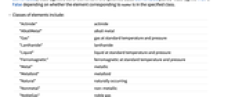 "Actinide" actinide "AlkaliMetal" alkali metal "Gas" gas at standard temperature and pressure "Lanthanide" lanthanide "Liquid" liquid at standard temperature and pressure "Ferromagnetic" ferromagnetic at standard temperature and pressure "Metal" metallic "Metalloid" metalloid "Natural" naturally occurring "Nonmetal" non-metallic "NobleGas" noble gas "Radioactive" radioactive in all forms "Solid" solid at standard temperature and pressure "Stable" stable with respect to radioactive decay "Synthetic" occurring only when synthesized - ElementData["name","property","ann"] gives various annotations associated with a property. Typical annotations include: