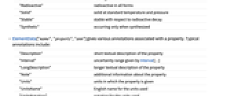 "Description" short textual description of the property "Interval" uncertainty range given by Interval[…] "LongDescription" longer textual description of the property "Note" additional information about the property "Units" units in which the property is given "UnitsName" English name for the units used "UnitsNotation" notation for the units used "UnitsStandardName" Wolfram Language standard name for the units used "Value" property value (default if no annotation is specified)