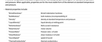 "Density" density at standard temperature and pressure "LiquidDensity" liquid density at melting point "MohsHardness" Mohs scratch resistance "MolarVolume" molar volume "PoissonRatio" Poisson ratio