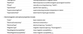 "ElectricalType" electrical type (e.g. "Insulator") "MagneticType" magnetic response type (e.g. "Paramagnetic") "MassMagneticSusceptibility" mass magnetic susceptibility
