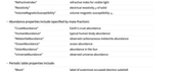 "CrustAbundance" Earth's crust abundance "HumanAbundance" typical human body abundance "MeteoriteAbundance" observed carbonaceous meteorite abundance "OceanAbundance" ocean abundance "SolarAbundance" abundance in the Sun "UniverseAbundance" observed universe abundance - Periodic table properties include: