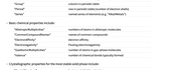 "AllotropicMultiplicities" numbers of atoms in allotropic molecules "CommonCompoundNames" names of common compounds "ElectronAffinity" electron affinity "Electronegativity" Pauling electronegativity "GasAtomicMultiplicities" number of atoms in gas-phase molecules "Valence" number of chemical bonds typically formed - Crystallographic properties for the most stable solid phase include: