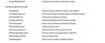 "DecayMode" dominant decay mode for longest-lived isotope "IsotopeAbundances" list of mass numbers and abundances of stable isotopes "IsotopeHalfLives" half-lives for all known isotopes "IsotopeLifetimes" exponential lifetimes for all known isotopes "KnownIsotopes" atomic mass numbers of all known isotopes "MolarRadioactivity" radioactivity per mole "NeutronCrossSection" thermal neutron cross section in barns "NeutronMassAbsorption" thermal neutron mass absorption coefficient "SpecificRadioactivity" specific radioactivity "StableIsotopes" atomic mass numbers of stable isotopes - Names-related properties include: