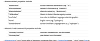 "Abbreviation" standard element abbreviation (e.g. "Na") "AllotropeNames" names of allotropes (e.g. "Graphite") "AlternateNames" alternate names (e.g. "Aluminium") "CASNumber" Chemical Abstract Service registry number "IconColor" icon color for Wolfram Language molecular graphics "Name" English name (e.g. "hydrogen") "StandardName" standard Wolfram Language name (e.g. "Hydrogen") - Historical and commercial properties include: