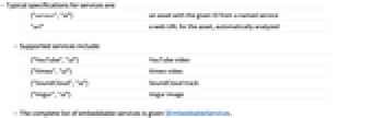 {"YouTube","id"} YouTube video {"Vimeo","id"} Vimeo video {"SoundCloud","id"} SoundCloud track {"Imgur","id"} Imgur image - The complete list of embeddable services is given $EmbeddableServices.