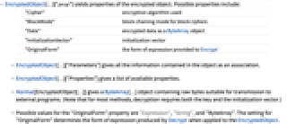- EncryptedObject[…]["prop"] yields properties of the encrypted object. Possible properties include:
