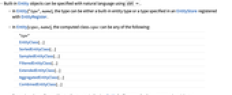 . - In Entity["type",name], the type can be either a built-in entity type or a type specified in an EntityStore registered with EntityRegister.