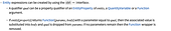- If entity[property] returns Function[params,body] with a parameter equal to qual, then the associated value is substituted into body and qual is dropped from params. If no parameters remain then the Function wrapper is removed.