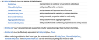EntityClass representation of a table or virtual table in a database FilteredEntityClass entity class filtered by a criterion SortedEntityClass entity class sorted by properties or functions SampledEntityClass entity class formed by sampling a number of entities ExtendedEntityClass entity class with properties added for each entity AggregatedEntityClass entity class formed by aggregating entities CombinedEntityClass entity class formed by combining properties across entity classes - EntityList["type"] is systematically supported only for types allowing a fixed number of entities.