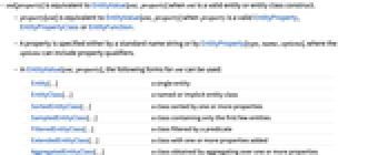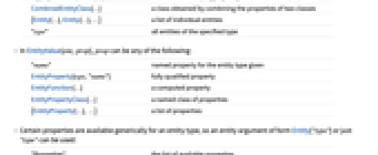 "name" named property for the entity type given EntityProperty[type,"name"] fully qualified property EntityFunction[…] a computed property EntityPropertyClass[…] a named class of properties {EntityProperty[…], …} a list of properties - Certain properties are available generically for an entity type, so an entity argument of form Entity["type"] or just "type" can be used: