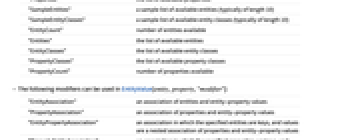 "Properties" the list of available properties "SampleEntities" a sample list of available entities (typically of length 10) "SampleEntityClasses" a sample list of available entity classes (typically of length 10) "EntityCount" number of entities available "Entities" the list of available entities "EntityClasses" the list of available entity classes "PropertyClasses" the list of available property classes "PropertyCount" number of properties available - The following modifiers can be used in EntityValue[entity,property,"modifier"]: