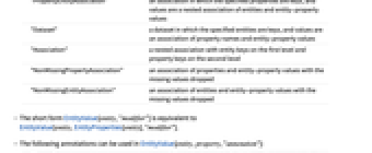 "EntityAssociation" an association of entities and entity-property values "PropertyAssociation" an association of properties and entity-property values "EntityPropertyAssociation" an association in which the specified entities are keys, and values are a nested association of properties and entity-property values "PropertyEntityAssociation" an association in which the specified properties are keys, and values are a nested association of entities and entity-property values "Dataset" a dataset in which the specified entities are keys, and values are an association of property names and entity-property values "Association" a nested association with entity keys on the first level and property keys on the second level "NonMissingPropertyAssociation" an association of properties and entity-property values with the missing values dropped "NonMissingEntityAssociation" an association of entities and entity-property values with the missing values dropped - The short form EntityValue[entity,"modifier"] is equivalent to EntityValue[entity,EntityProperties[entity],"modifier"].