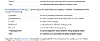"Qualifiers" the list of possible qualifiers for the property "QualifierValues" the list of possible values that can be given to each qualifier "Label" the label of the property "Definition" a detailed textual definition of the property "Source" source information for the property "PhysicalQuantity" the physical quantity associated with entity-property values "Unit" the common unit associated with entity-property values - A qualifier value of Automatic indicates that an applicable format of values can be used, e.g. for the "Date" qualifier; this includes a proper date or date span.