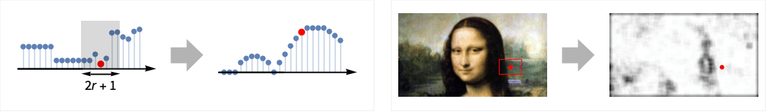filters data by replacing every value by the entropy value in its range-r neighborhood.