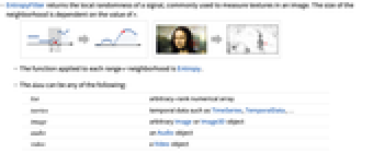 - EntropyFilter returns the local randomness of a signal, commonly used to measure textures in an image. The size of the neighborhood is dependent on the value of r.