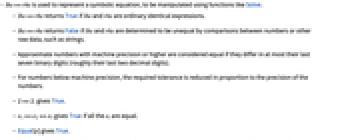 - For exact numeric quantities, Equal internally uses numerical approximations to establish inequality. This process can be affected by the setting of the global variable $MaxExtraPrecision.
