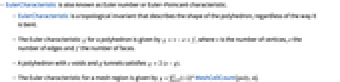Wolfram Language. (2019). EulerCharacteristic. Wolfram Language & System Documentation Center. Retrieved from https://reference.wolfram.com/language/ref/EulerCharacteristic.html