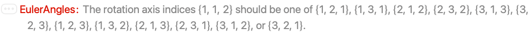 - Rotations with subsequent axes repeated still produce a rotation matrix but cannot be inverted uniquely using EulerAngles.