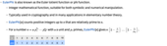 - EulerPhi[n] counts positive integers up to n that are relatively prime to n.