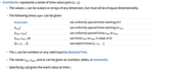 - EventSeries objects of equal dimensionality {es1,es2,…} can be combined into a TemporalData object using TemporalData[{es1,es2,…}].