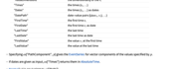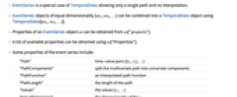"Path" time-value pairs {{t1,v1},…} "PathComponents" split the multivariate path into univariate components "PathFunction" an interpolated path function "PathLength" the length of the path "Values" the values {v1,…} "ValueDimensions" the dimensionality of the vi "Times" the times {t1,…} "Dates" the times {t1,…} as dates "DatePath" date-value pairs {{date1,v1},…} "FirstTime" the first time t1 "FirstDate" the first time t1 as date "LastTime" the last time "LastDate" the last time as date "FirstValue" the value v1 at the first time "LastValue" the value at the last time - Specifying es["PathComponent",p] gives the EventSeries for vector components of the values specified by p.