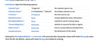 CalendarType "Gregorian" the calendar type to use HolidayCalendar {"UnitedStates","Default"} the holiday calendar to use TimeZone $TimeZone the time zone to use MetaInformation None include additional meta-information MissingDataMethod None method to use for missing values TemporalRegularity Automatic whether to assume the data is regular DateFunction Automatic how to convert dates to standard form ValueDimensions Automatic the dimensions of the values - Setting the MissingDataMethod->Automatic will automatically interpolate values with head Missing by value from the left. By default, values with head Missing are treated as missing.