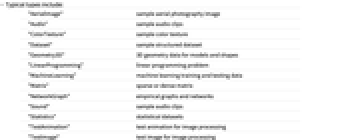 "AerialImage" sample aerial photography image "Audio" sample audio clips "ColorTexture" sample color texture "Dataset" sample structured dataset "Geometry3D" 3D geometry data for models and shapes "LinearProgramming" linear programming problem "MachineLearning" machine learning training and testing data "Matrix" sparse or dense matrix "NetworkGraph" empirical graphs and networks "Sound" sample audio clips "Statistics" statistical datasets "TestAnimation" test animation for image processing "TestImage" test image for image processing "TestImage3D" test 3D volume for image processing "TestImageSet" test image collections "Text" sample text piece "Texture" sample texture - ExampleData[{"type","name"},"Properties"] gives a list of the elements or properties available for a particular example.