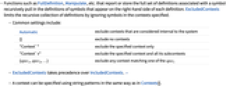 - Functions such as FullDefinition, Manipulate, etc. that report or store the full set of definitions associated with a symbol recursively pull in the definitions of symbols that appear on the right-hand side of each definition. ExcludedContexts limits the recursive collection of definitions by ignoring symbols in the contexts specified.