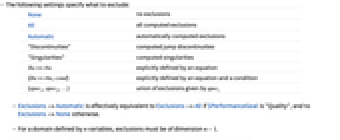 None no exclusions All all computed exclusions Automatic automatically computed exclusions "Discontinuities" computed jump discontinuities "Singularities" computed singularities lhs==rhs explicitly defined by an equation {lhsrhs,cond} explicitly defined by an equation and a condition {spec1,spec2,…} union of exclusions given by speci - Exclusions->Automatic is effectively equivalent to Exclusions->All if $PerformanceGoal is "Quality", and to Exclusions->None otherwise.